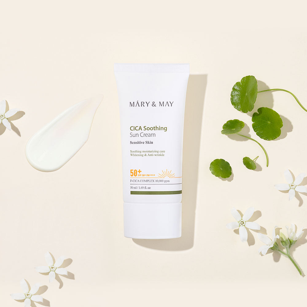 Mary&May Cica Soothing Suncream, Triple functional sunscreen for UV protection/whitening/wrinking improvement, which adds 10,000ppm of Cica complex to provide a strong UV protection and calming effect on skin damagend by external irritation