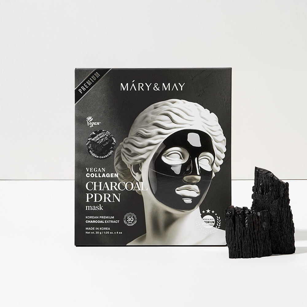 Mary&May Vegan Collagen Charcoal PDRN Mask, a hydrogel mask containing domestically produced charcoal that absorbs and purifies pore impurities to restore the skin's natural radiance, PDRN that promotes skin vitality and elasticity improvement, and low-molecular-weight vegan collagen that delivers dense elasticity deep into the skin, providing both radiance and firming care, 30g x 4 sheets